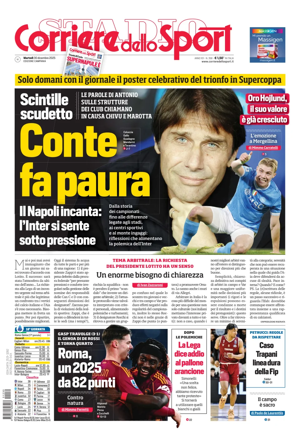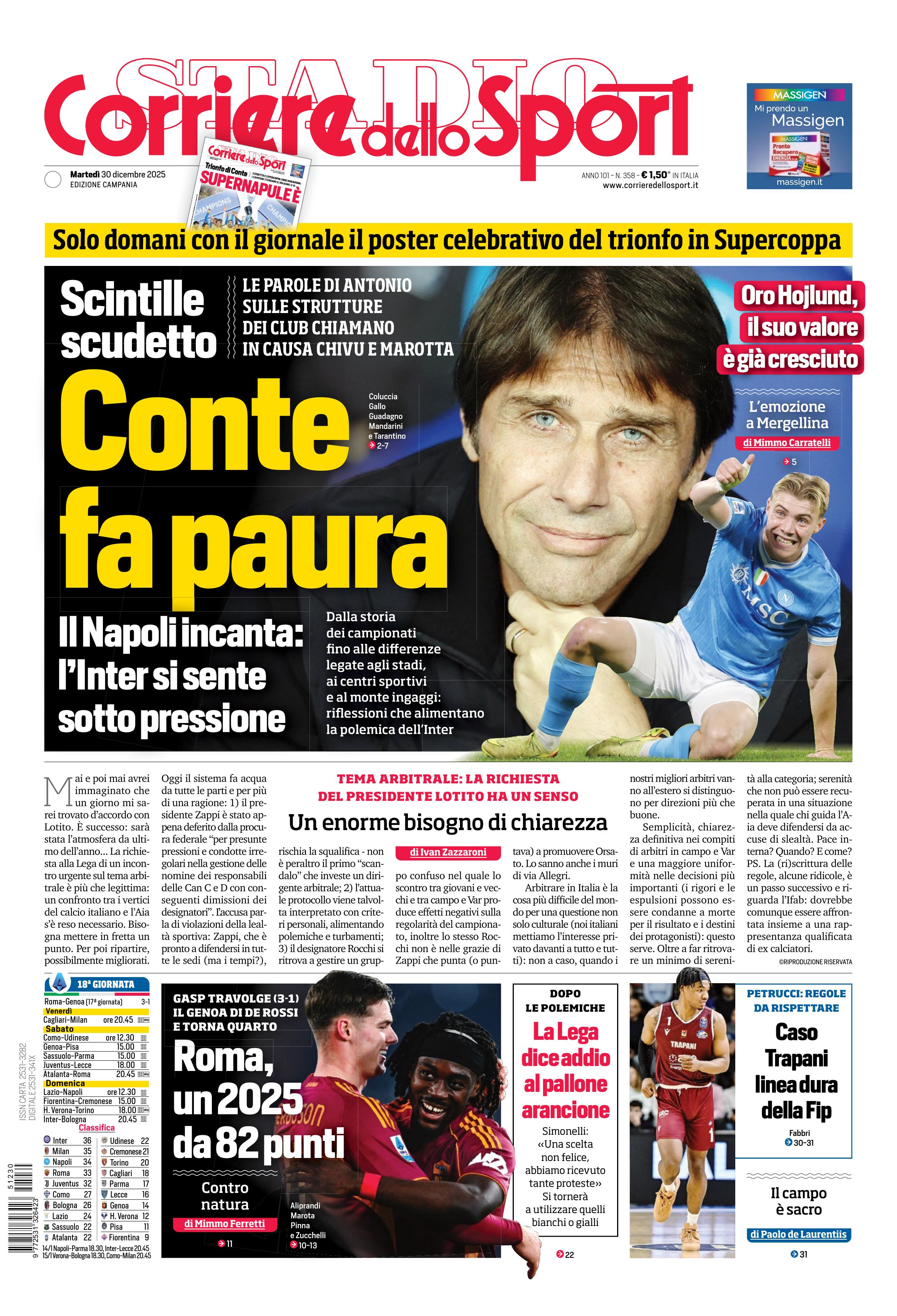 Qui di seguito vi riportiamo la prima pagina dell'edizione Campania del quotidiano 'Il Corriere dello Sport' che troverete in edicola il giorno 30 dicembre 2025.