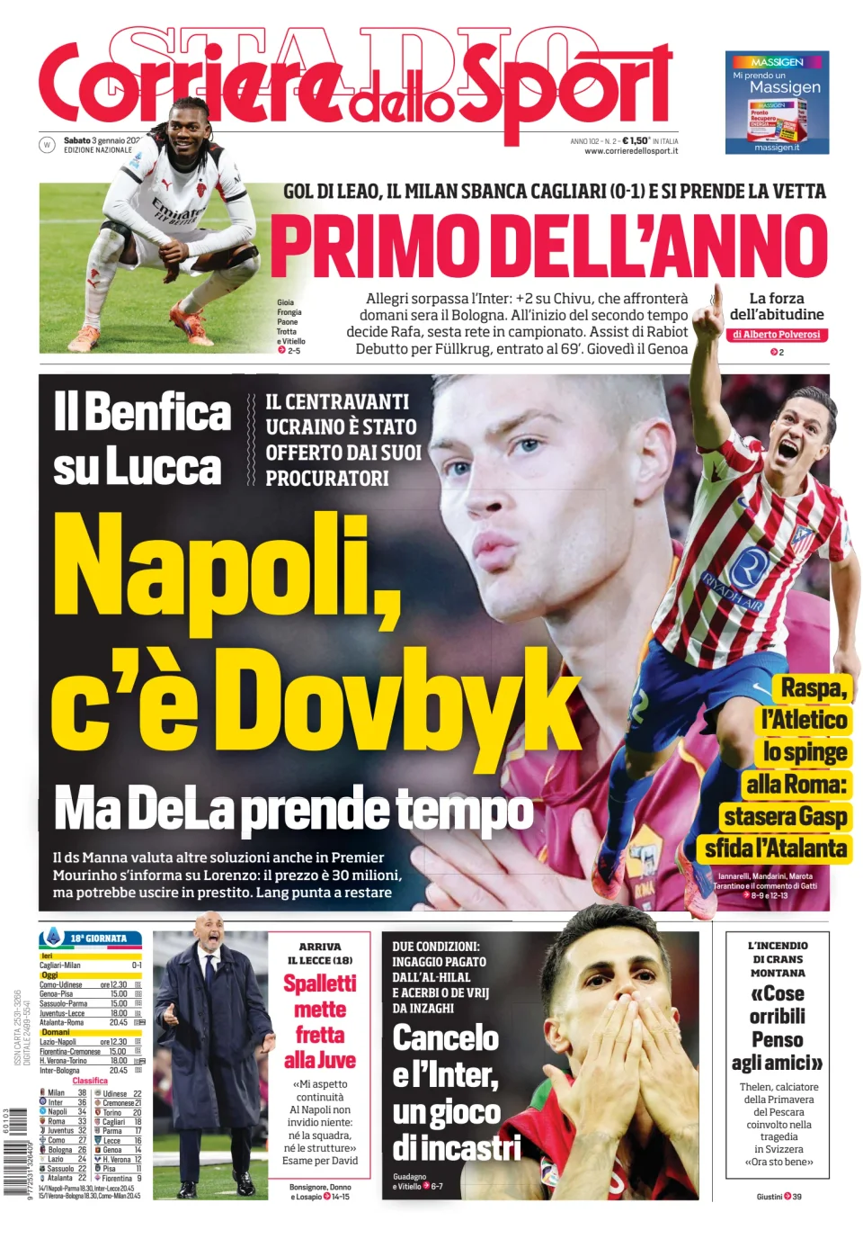 Di seguito potete trovare le prime pagine dei tre quotidiani sportivi, relativamente alle edizioni Nazionali in edicola il giorno 3 gennaio 2026.