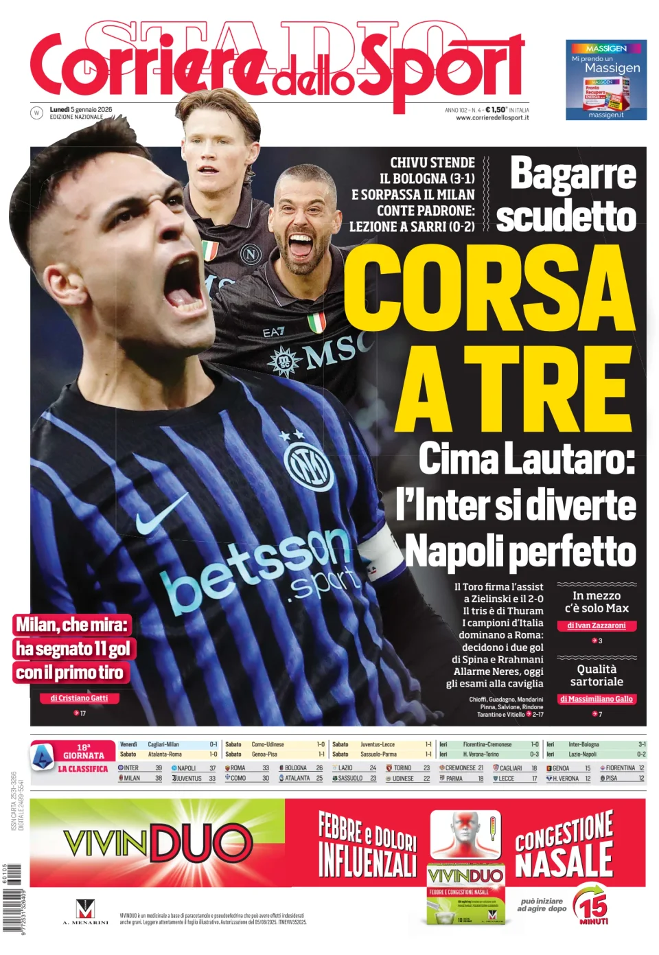 Di seguito potete trovare le prime pagine dei tre quotidiani sportivi, relativamente alle edizioni Nazionali in edicola il giorno 5 gennaio 2026.