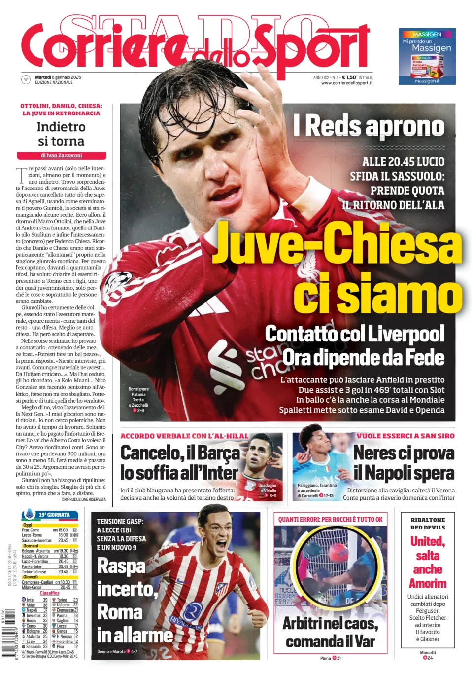 Di seguito potete trovare le prime pagine dei tre quotidiani sportivi, relativamente alle edizioni Nazionali in edicola il giorno 6 gennaio 2026.