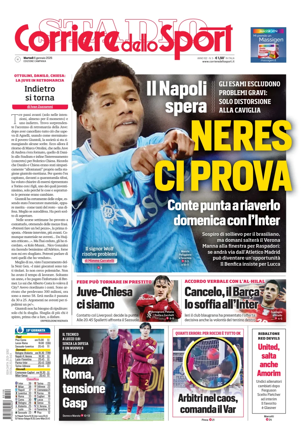 Qui di seguito vi riportiamo la prima pagina dell'edizione Campania del quotidiano 'Il Corriere dello Sport' che troverete in edicola il giorno 6 gennaio 2026.