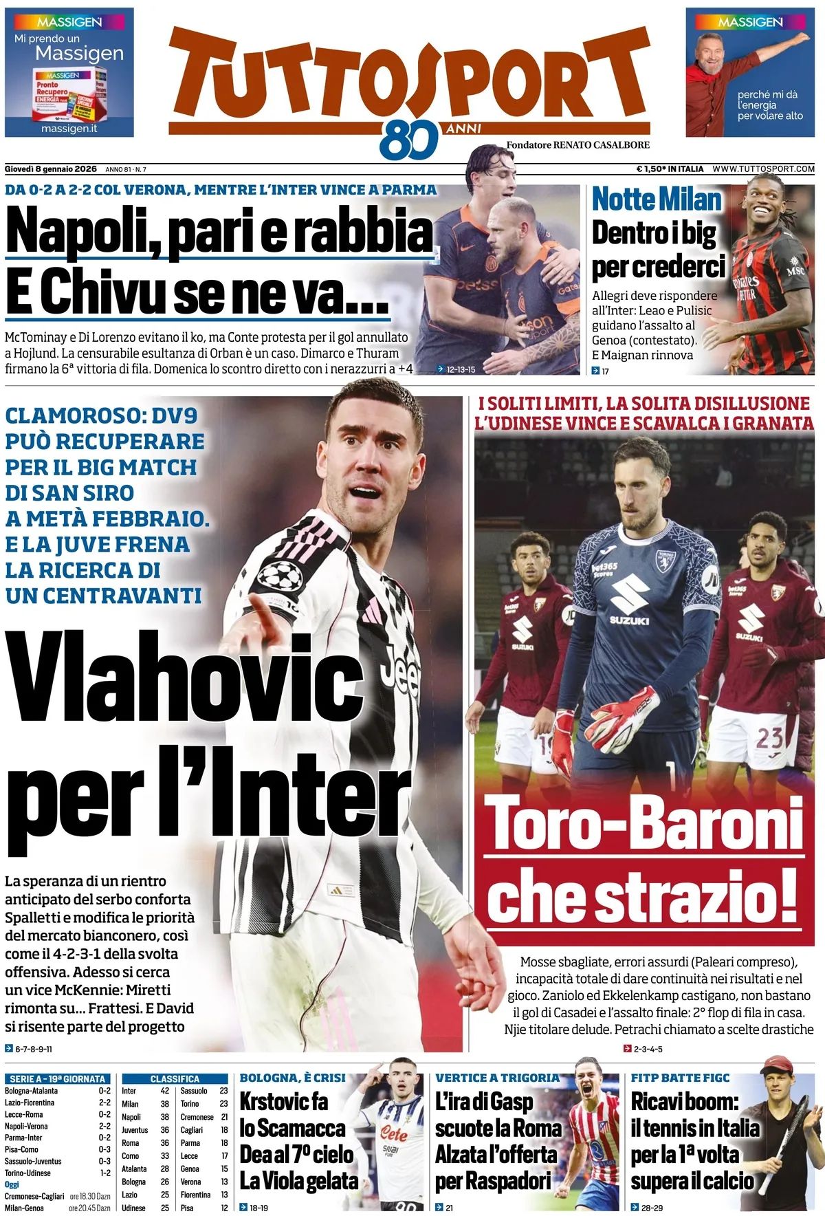 Di seguito potete trovare le prime pagine dei tre quotidiani sportivi, relativamente alle edizioni Nazionali in edicola il giorno 8 gennaio 2026.