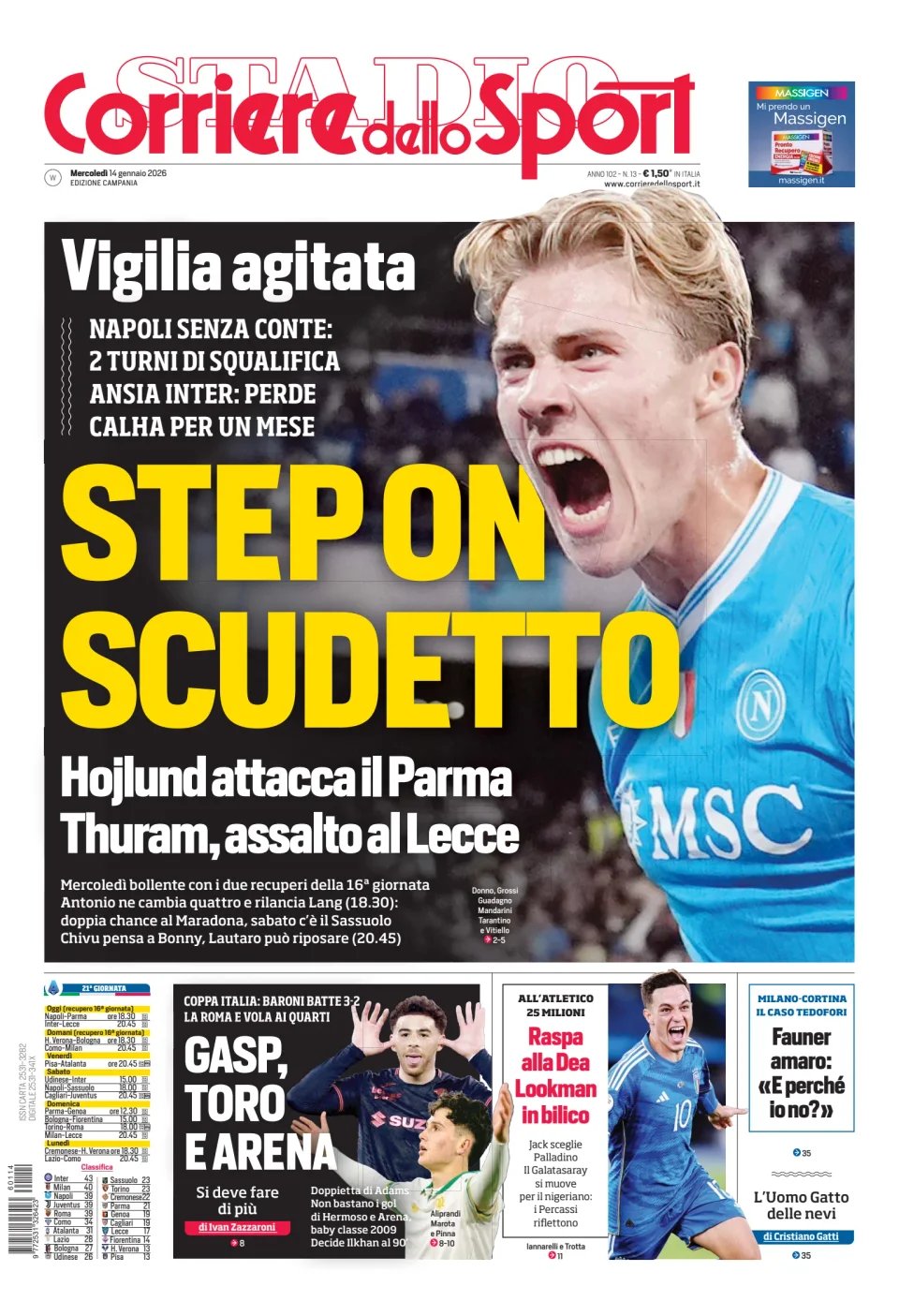 Qui di seguito vi riportiamo la prima pagina dell'edizione Campania del quotidiano 'Il Corriere dello Sport' che troverete in edicola il giorno 14 gennaio 2026.