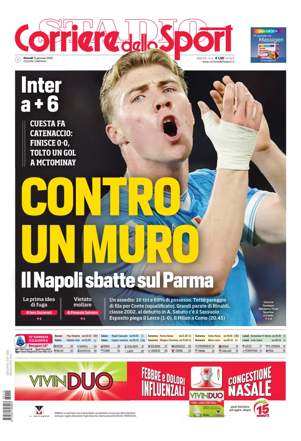 Qui di seguito vi riportiamo la prima pagina dell'edizione Campania del quotidiano 'Il Corriere dello Sport' che troverete in edicola il giorno 15 gennaio 2026.