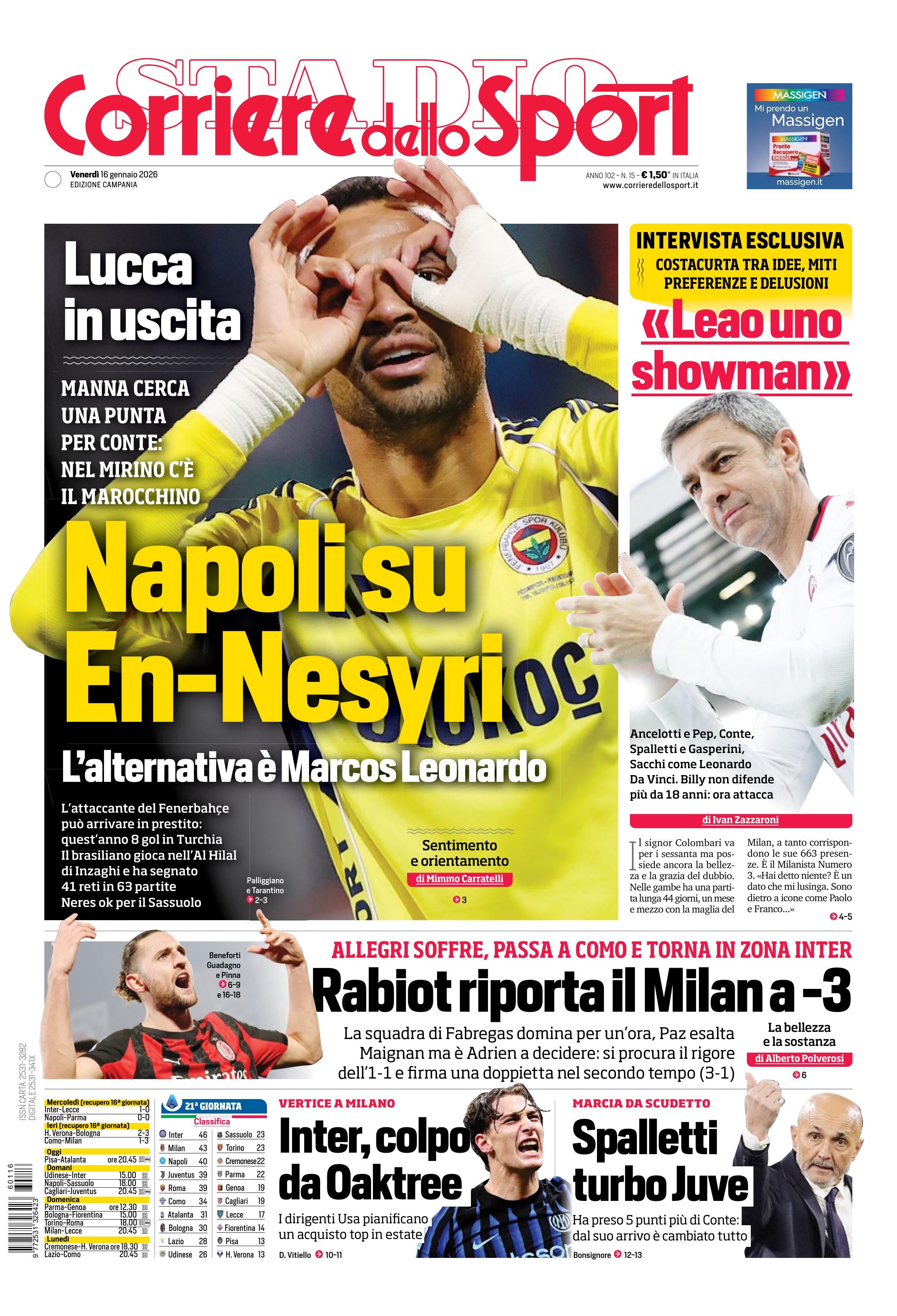 Di seguito potete trovare le prime pagine dei tre quotidiani sportivi, relativamente alle edizioni Nazionali in edicola il giorno 16 gennaio 2026.