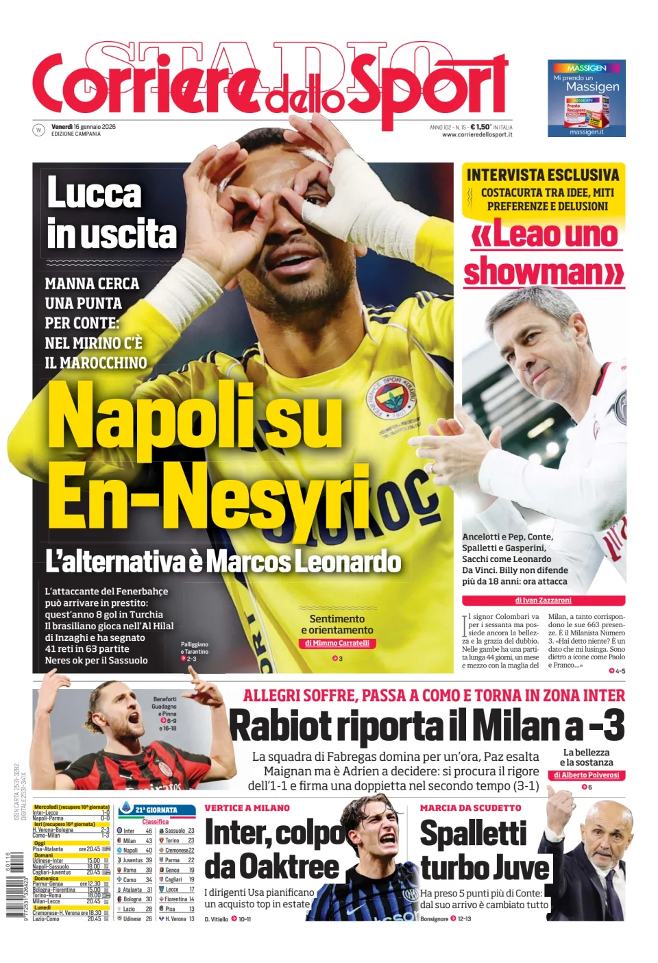 Qui di seguito vi riportiamo la prima pagina dell'edizione Campania del quotidiano 'Il Corriere dello Sport' che troverete in edicola il giorno 16 gennaio 2026.