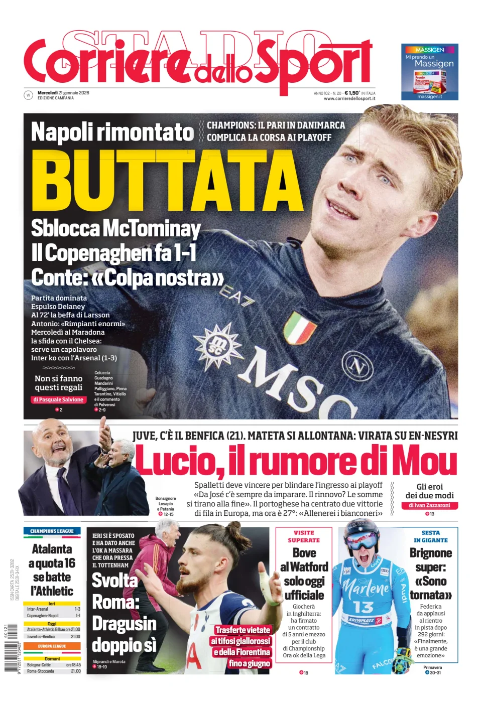 Qui di seguito vi riportiamo la prima pagina dell'edizione Campania del quotidiano 'Il Corriere dello Sport' che troverete in edicola il giorno 21 gennaio 2026.