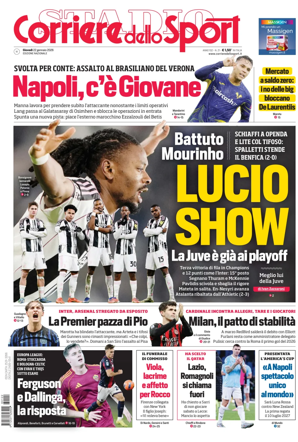 Di seguito potete trovare le prime pagine dei tre quotidiani sportivi, relativamente alle edizioni Nazionali in edicola il giorno 22 gennaio 2026.