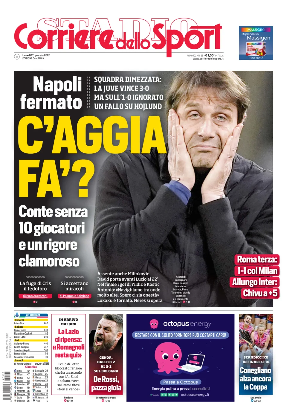Qui di seguito vi riportiamo la prima pagina dell'edizione Campania del quotidiano 'Il Corriere dello Sport' che troverete in edicola il giorno 26 gennaio 2026.