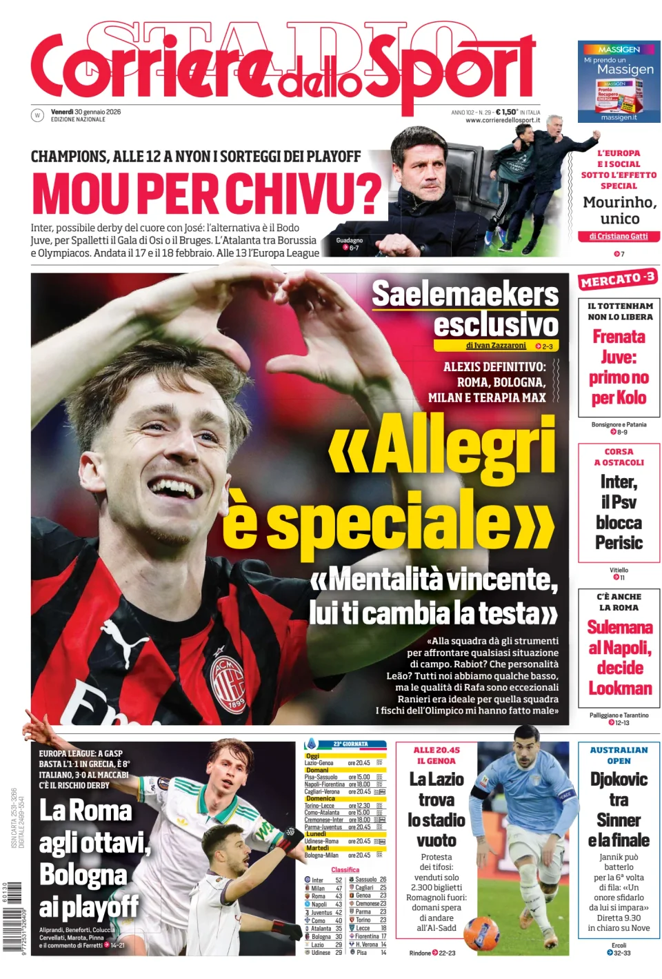Di seguito potete trovare le prime pagine dei tre quotidiani sportivi, relativamente alle edizioni Nazionali in edicola il giorno 30 gennaio 2026.