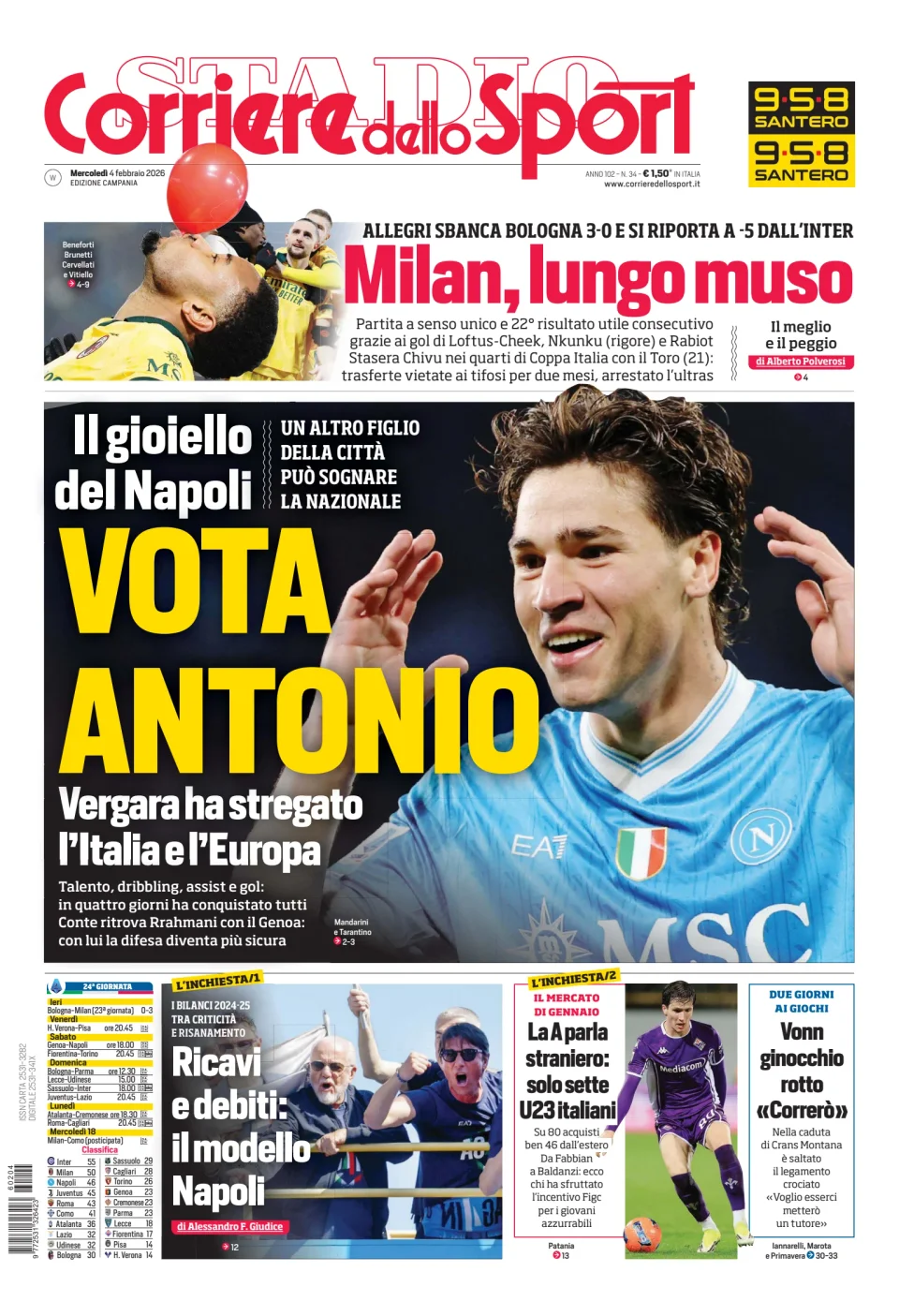Qui di seguito vi riportiamo la prima pagina dell'edizione Campania del quotidiano 'Il Corriere dello Sport' che troverete in edicola il giorno 4 febbraio 2026.