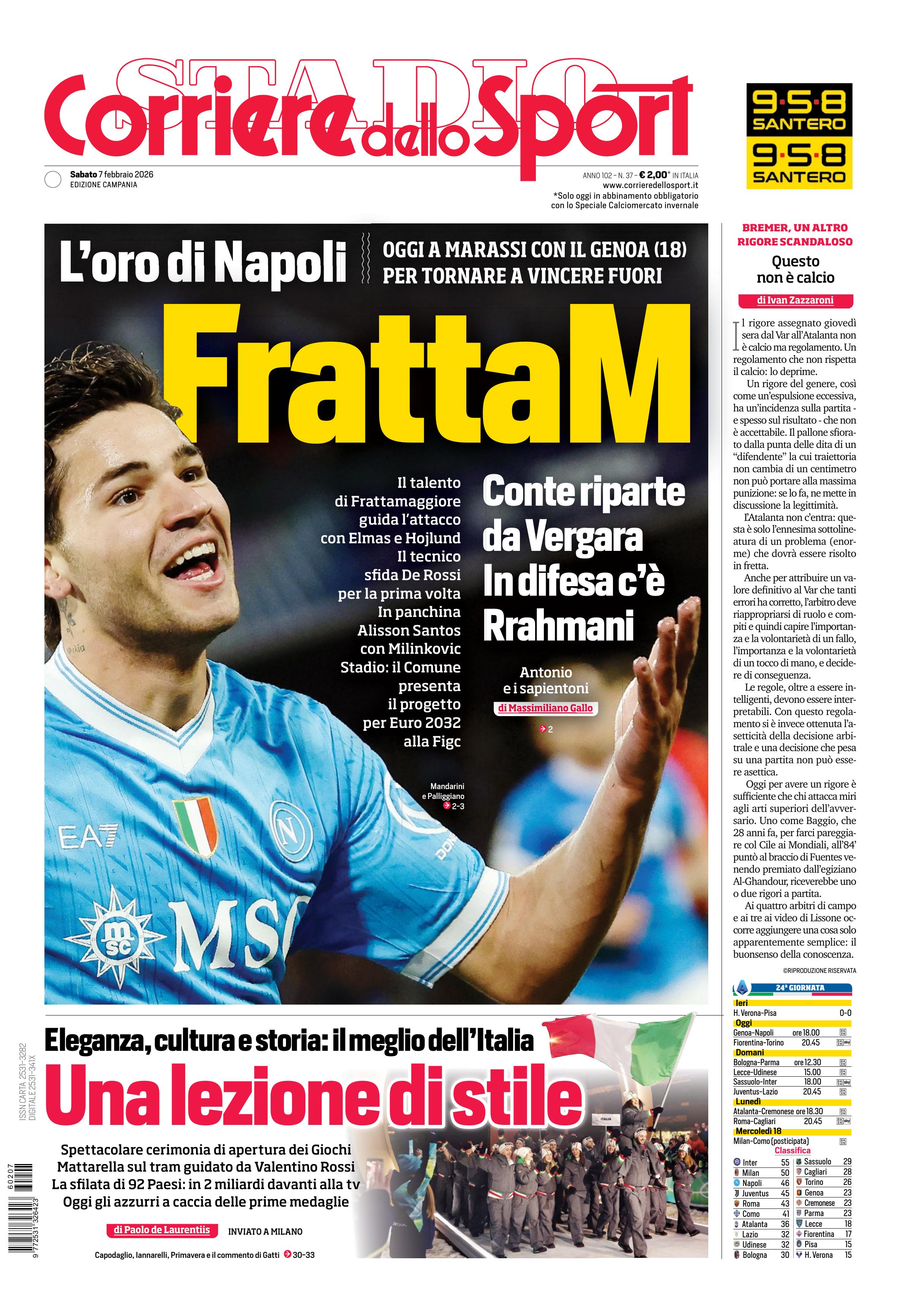 Qui di seguito vi riportiamo la prima pagina dell'edizione Campania del quotidiano 'Il Corriere dello Sport' che troverete in edicola il giorno 7 febbraio 2026.