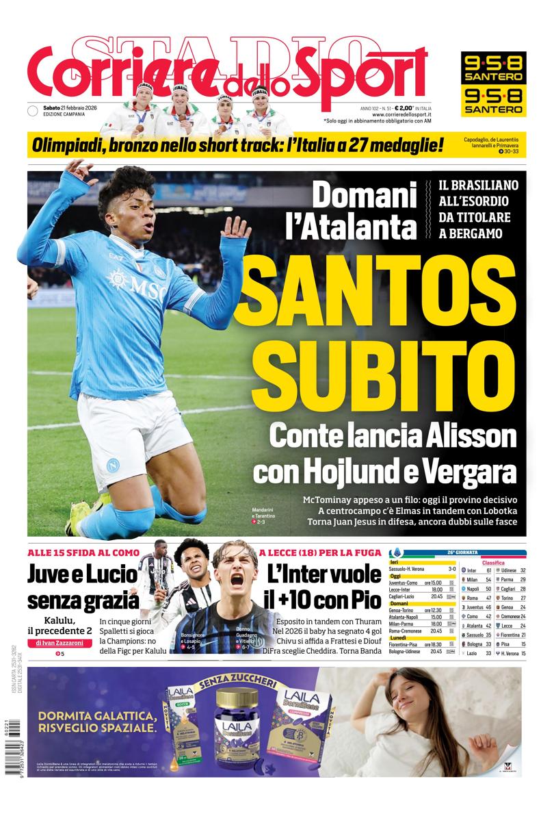 Qui di seguito vi riportiamo la prima pagina dell'edizione Campania del quotidiano 'Il Corriere dello Sport' che troverete in edicola il giorno 21 febbraio 2026.