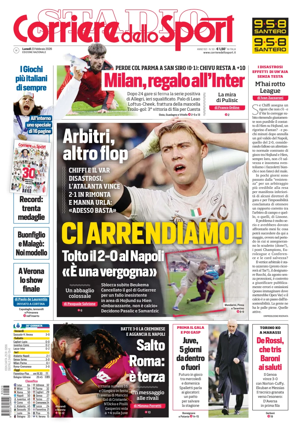 RASSEGNA STAMPA SPORTIVA - Prime pagine dei quotidiani del 23 febbraio 2026