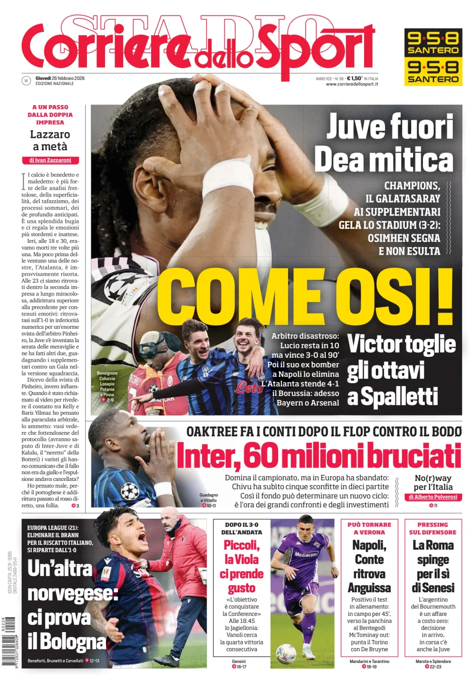 Di seguito potete trovare le prime pagine dei tre quotidiani sportivi, relativamente alle edizioni Nazionali in edicola il giorno 26 febbraio 2026.