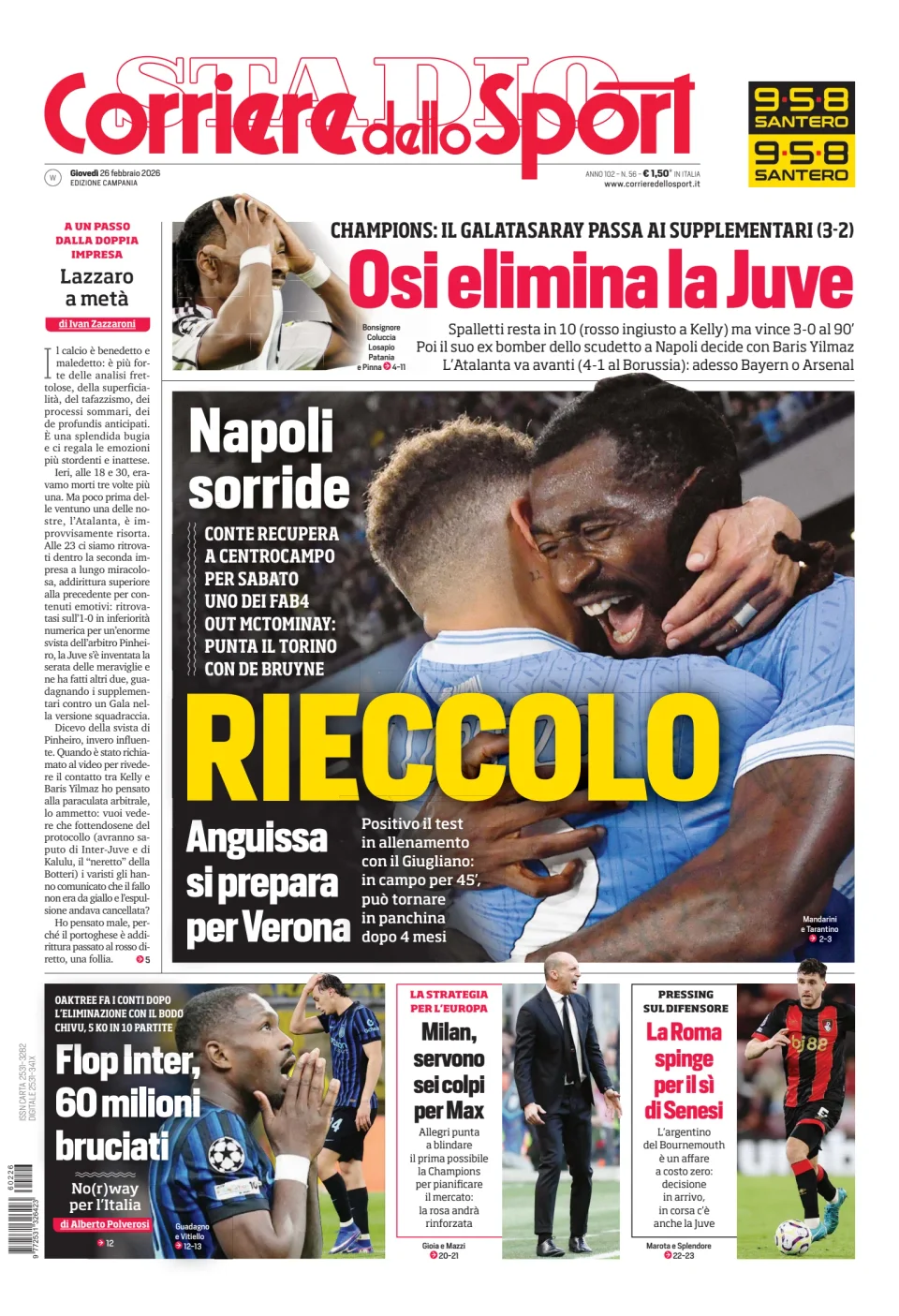 Qui di seguito vi riportiamo la prima pagina dell'edizione Campania del quotidiano 'Il Corriere dello Sport' che troverete in edicola il giorno 26 febbraio 2026.