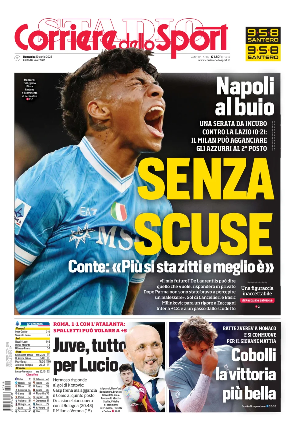 Qui di seguito vi riportiamo la prima pagina dell'edizione Campania del quotidiano 'Il Corriere dello Sport' che troverete in edicola il giorno 19 aprile 2026.