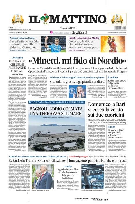 Vi riportiamo la prima pagina del quotidiano napoletano 'Il Mattino' che troverete in edicola il giorno 29 aprile 2026.